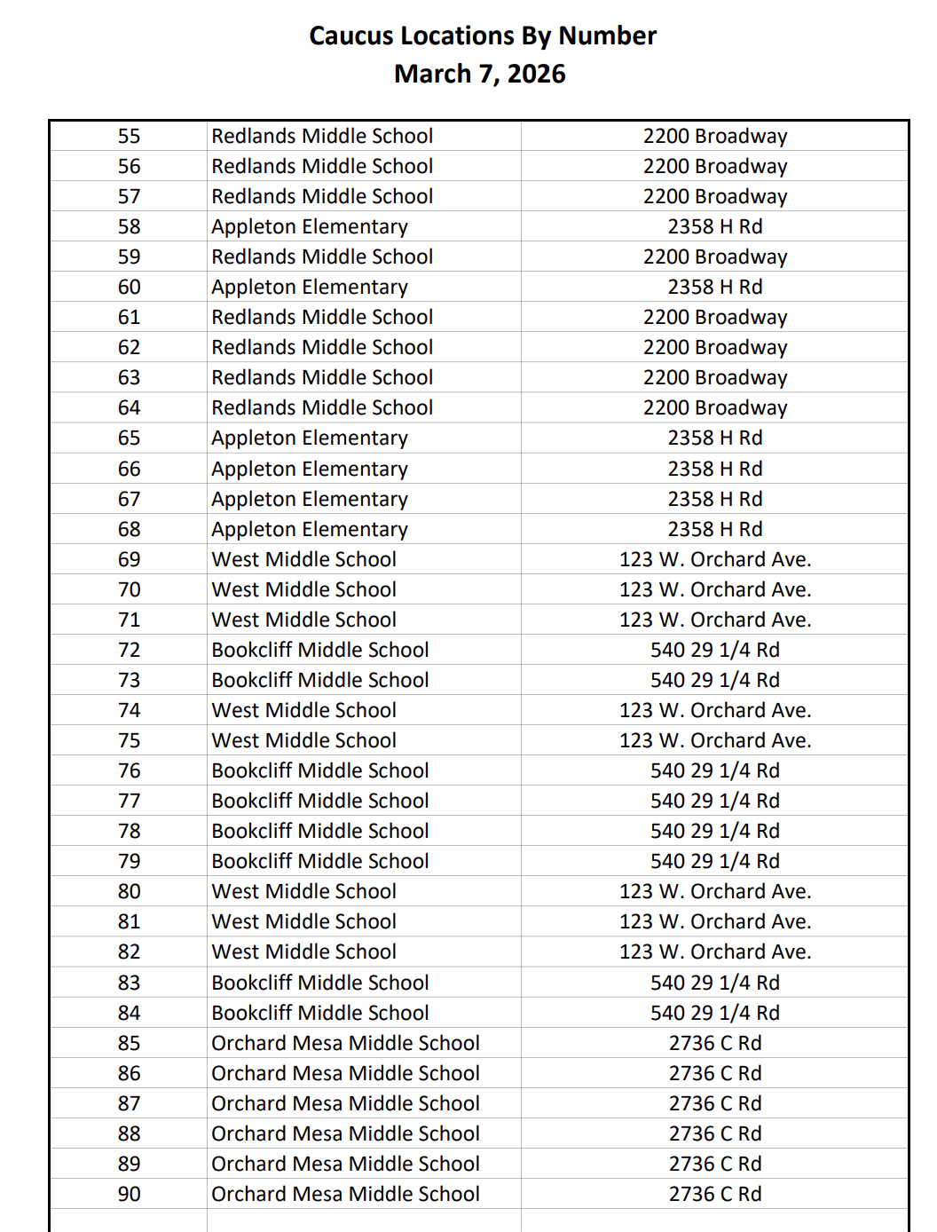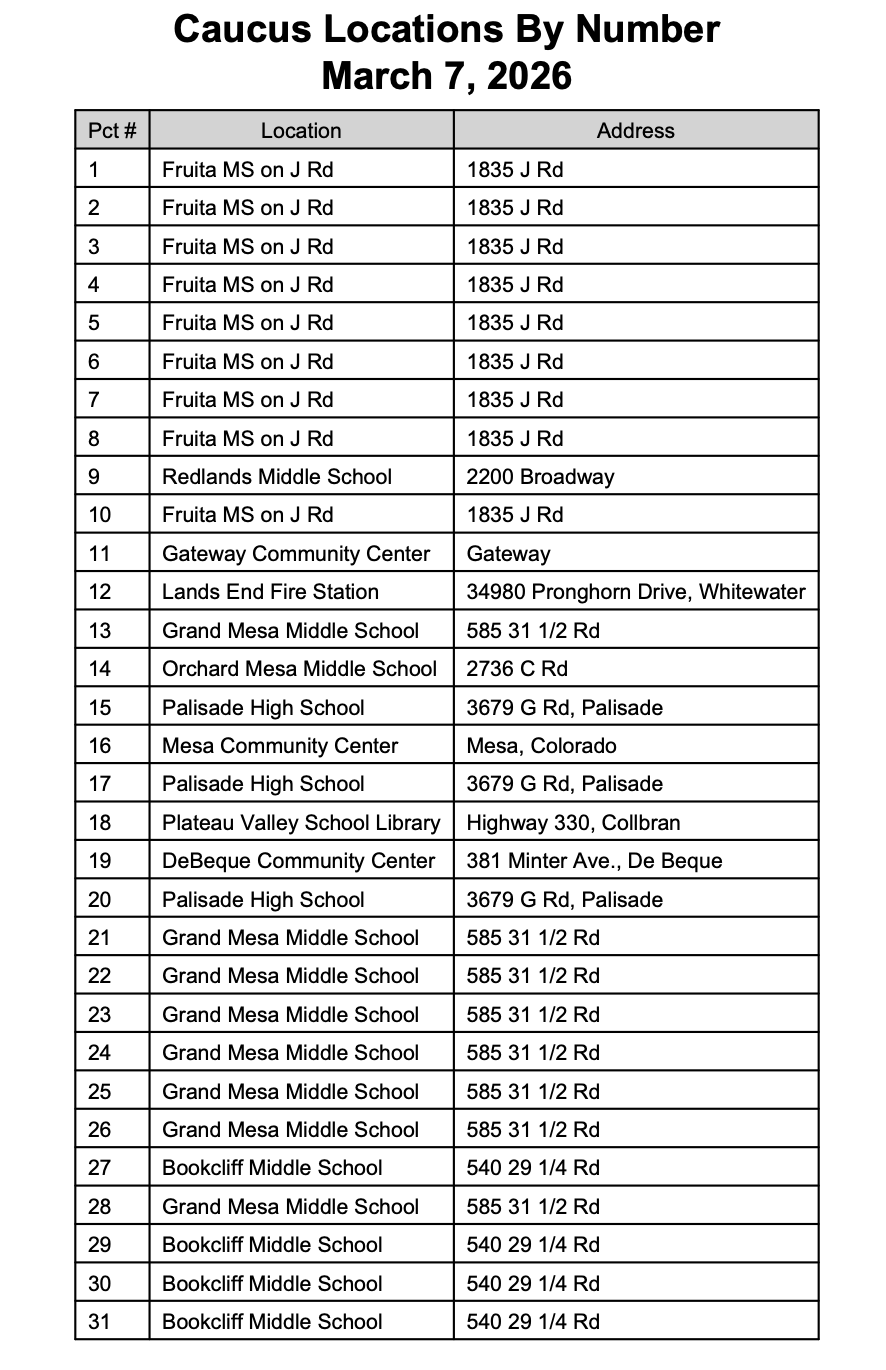 Precinct Caucus for the Republican Party will be on March 7th at various locations listed below. Caucus starts at 9 am, so we recommend arriving by 8 or 8:30 as registration begins at 8:30. Need help finding your precinct number? Check the Mesa County Elections website or use the Colorado Secretary of State’s Find My Voter Registration tool. Precinct number is the last 2-3 digits in your County & District Information. The county assembly will be on March 28th, at Palisade High School. It will start at 10 am, but registration and check-in usually take some time, so plan to arrive at 7:30 or 8:00 am.