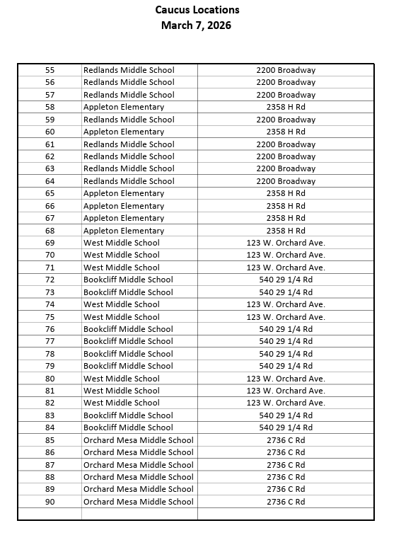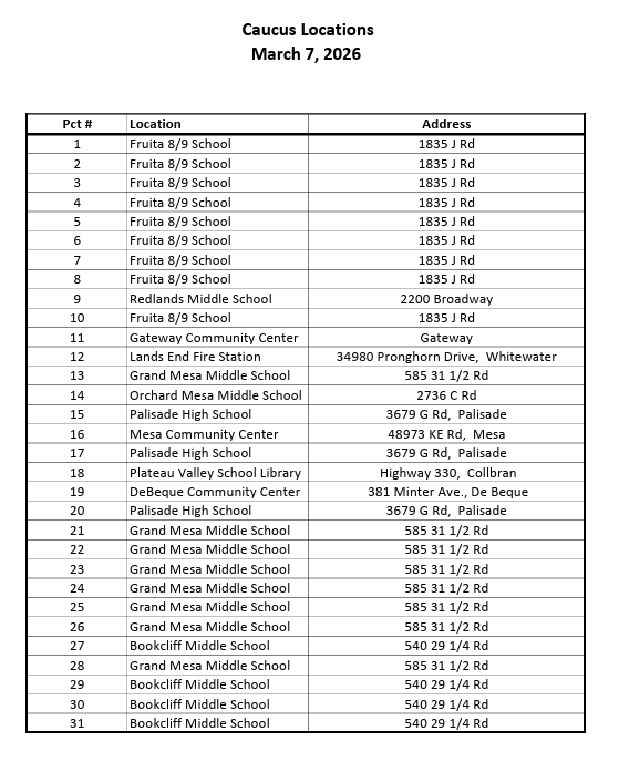 Precinct Caucus for the Republican Party will be on March 7th at various locations listed below. Caucus starts at 9 am, so we recommend arriving by 8 or 8:30 at the latest to be checked in. Need help finding your precinct number? Check the Mesa County Elections website or use the Colorado Secretary of State’s Find My Voter Registration tool. Precinct number is the last 2-3 digits in your County & District Information. The county assembly will be on March 28th, at Palisade High School. It will start at 9 am, but registration and check-in usually take some time, so plan to arrive at 7:30 or 8:00 am.
